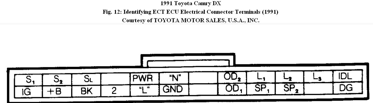 9. Check for battery voltage between terminals "L" and GND on ECT ECU with connector installed on ECT ECU and shift lever in "D" position. See Fig. 12. If battery voltage exists, check for defective neutral start switch or wiring circuit. If battery voltage does not exist, replace ECT ECU.