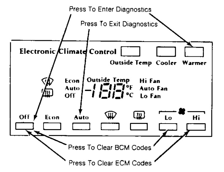Turn ignition on. Simultaneously depress OFF and WARMER buttons on CP until "8.8.8" appears on FDC panel, and "-188" appears on CP. See Fig. 1 and Fig. 26. Code "8.8.8" appears as a check of all display segments and to indicate the beginning of diagnostic readout.