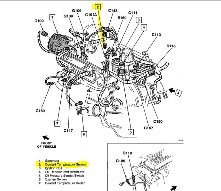 Now, there are two coolant temperature sensors on the engine. One is for the ECM and the other is for the fan/temp gauge. The one you need to replace is on the top of the engine, not the one on the side. I attached a pic below.
