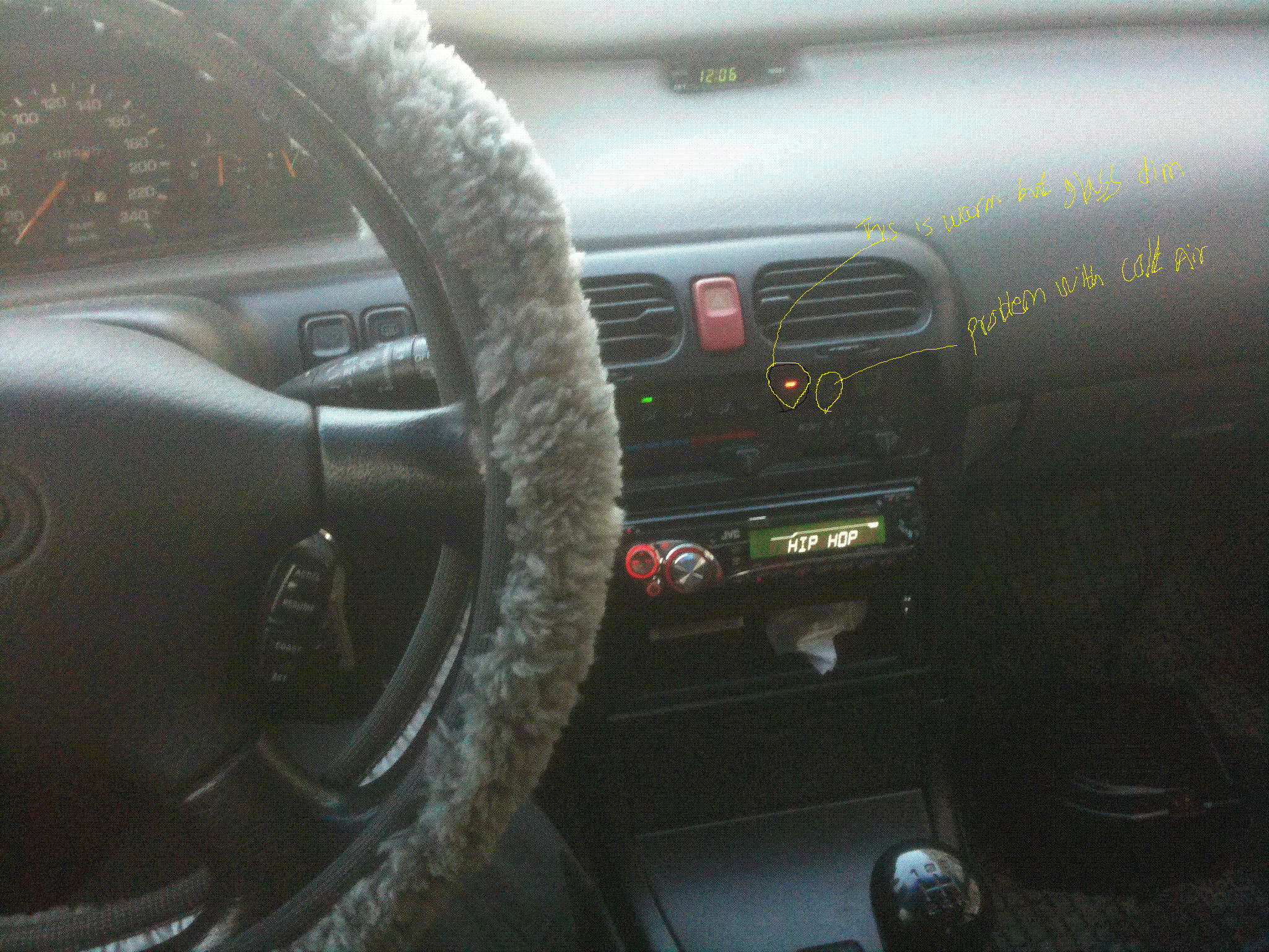 my car is very strange if I am press air circulation button came warm air but my glass became dim and not see well and if I am choose air from out side car button it only came cold air, I have change thermostat, flush radiator, and get warm only with air circulation button, that the problem