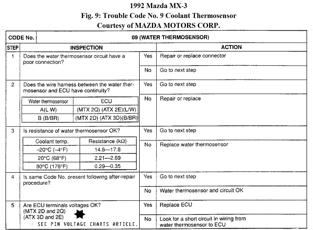SO here is my problem. I have a 1992 Mazda Mx-3 with a 1.6L inline SOHC Engine 98ci. It has 178400+ miles on the odo. For a while now (I'd say over a year) the check engine light comes on and goes back off when the engine reached full temperature. Recently, it will start and then try to stall out mid-way warm up and indeed it would stall if I don't give it an 1/8th of a throttle, any more and it WILL stall. First I changed the starter (it was going to need one), then under my father's suggestion I changed the fuel pump (old one seemed all right). It continued / continues to have the same problem of idol fluctuation and falling on it's face so. I had smartened up and checked the Chilton manual for error codes. I did an OBD1 diagnostics test and got the coolant temperature sensor as the culprit. The sensor was shot, it came out of the block in two pieces (the plastic wiring housing failed from the sensor itself). I have since changed the sensor and all seemed well after I had recently reset the computer (disconnected negative terminal on the battery and held brake for 5 seconds as recommended by the Chilton manual). I think it's semi-important to mention that I was having problems with the dual cooling fans what with the secondary fan not kicking on even while using the AC unit while the primamry fan would usually come on upon turning the ignition to the "on" position. Since I changed the temperature coolant sensor and inspected the relays, the fans operate as they should as of now. I have since driven the car 67 miles since the last computer reset. It is still refusing to start sometime even now while cold, still trying to fall on it's face mid-way warm up and the idol still fluctuates on it's own as if the car was staring for a remake of the movie Christine. (Fluctuations from est. 450RPMs to- 1800 RPMs. Usually idols at 1500RPMs until up to a safe running temperature when all is normal.)