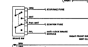 Note the diagram for brake switch. Orange wire carries voltage to brake switch for brake lites. The brake pedal arm activates the brake switch, that line with the arrow-head moves to the white wire terminal, the white wire carries voltage to turn signal switch. The brake lites are wired through the turn switch.