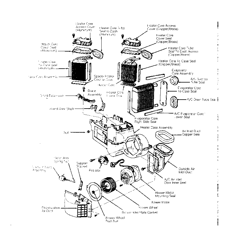 Remove heater core access cover screws. See Fig. 5. Remove access cover and seal from heater/evaporator case. Lift heater core and case seals out of heater/evaporator case.
