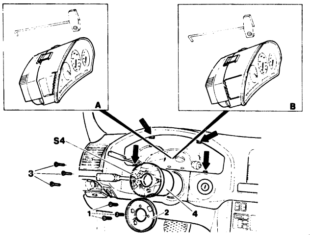 NOTE: The instrument cluster is held by 4 spring clips attached to the instrument panel (arrows).