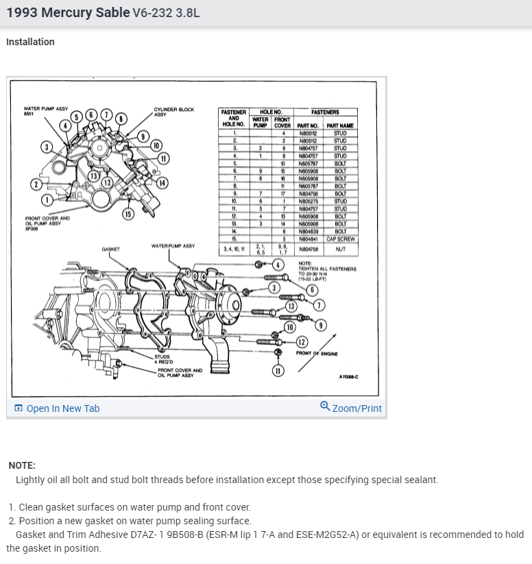 Position a new gasket on water pump sealing surface. Gasket and Trim Adhesive D7AZ- 1 9B508-B (ESR-M lip 1 7-A and ESE-M2G52-A) or equivalent is recommended to hold the gasket in position.