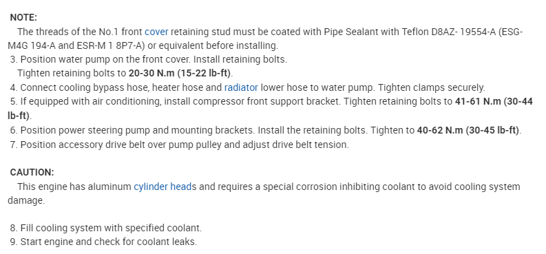 The threads of the No.1 front cover retaining stud must be coated with Pipe Sealant with Teflon D8AZ- 19554-A (ESG-M4G 194-A and ESR-M 1 8P7-A) or equivalent before installing.
