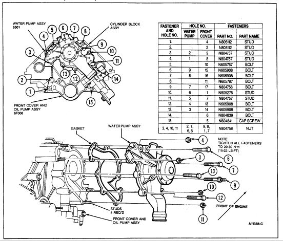 Position water pump on the front cover. Install retaining bolts. Tighten retaining bolts to 20-30 N.M (15-22 lb-ft).