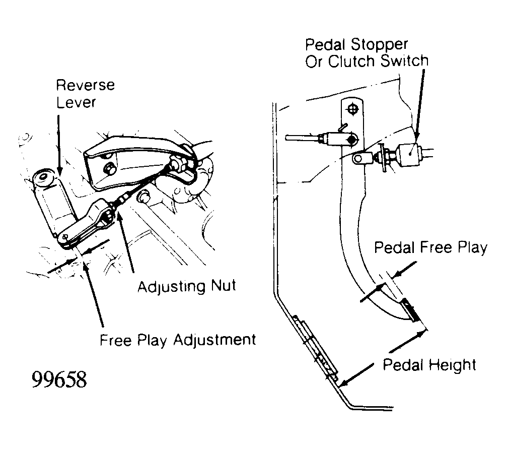 Back off adjusting nut 2.5-3.5 turns. Free play at release lever clevis pin should be.10-.14" (2.5-3.5 mm). Free play at clutch pedal pad should be.43-.59" (10.9-15.0 mm).