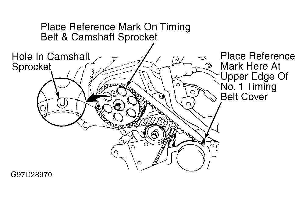 CAUTION:If reusing timing belt, mark direction of timing belt rotation on belt. Place mating marks on timing belt at camshaft sprocket and at crankshaft sprocket for reassembly reference. Also place reference mark on timing belt at upper edge of No. 1 timing belt cover. See Fig. 2.