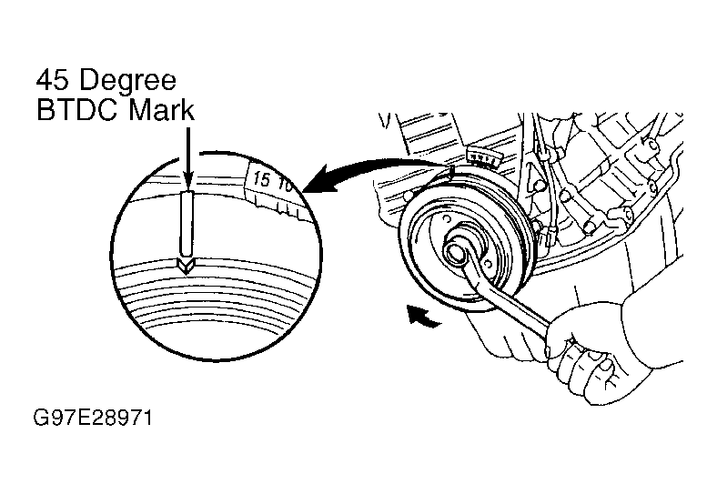 Rotate crankshaft clockwise 1 and 7/8 revolutions and align crankshaft pulley "0" mark with 45-degree Before Top Dead Center (BTDC) mark on No. 1 timing belt cover. See Fig. 5.