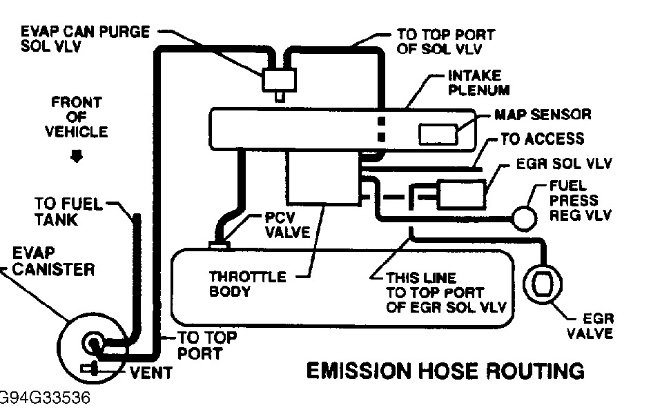 What is the routing for the emission hoses on a 1994 Buick Century 2.2 4 cyl and where is the access