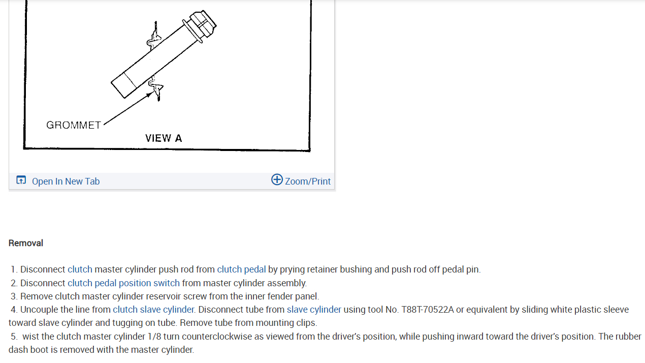 4. Uncouple the line from clutch slave cylinder. Disconnect tube from slave cylinder using tool No. T88T-70522A or equivalent by sliding white plastic sleeve toward slave cylinder and tugging on tube. Remove tube from mounting clips.