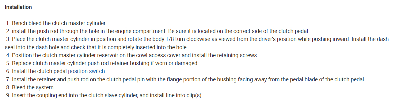 5. wist the clutch master cylinder 1/8 turn counterclockwise as viewed from the driver's position, while pushing inward toward the driver's position. The rubber dash boot is removed with the master cylinder.