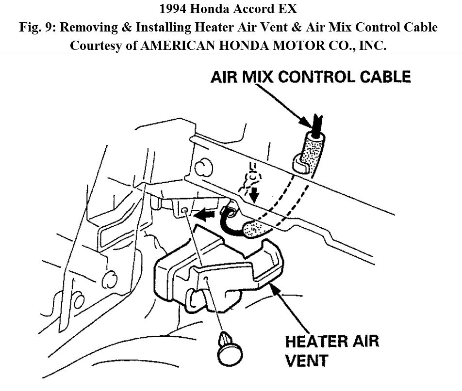 3. Remove the heater air vent, and disconnect the air mix control cable. See Fig. 9.