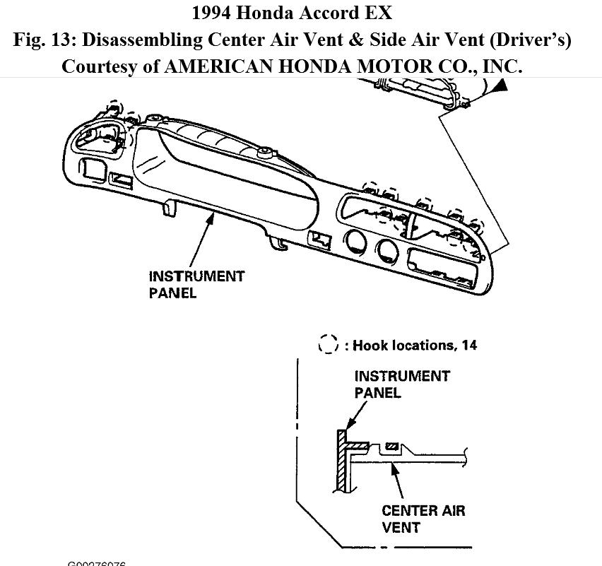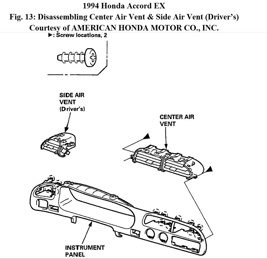 6. If necessary, disassemble the center air vent and side air vent (driver's). See Fig. 13. To install, reverse removal procedure.