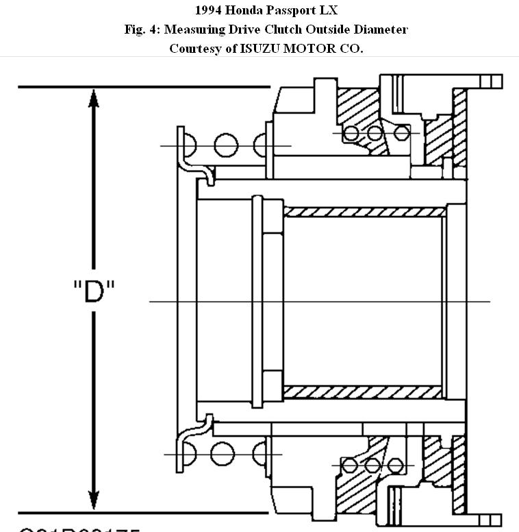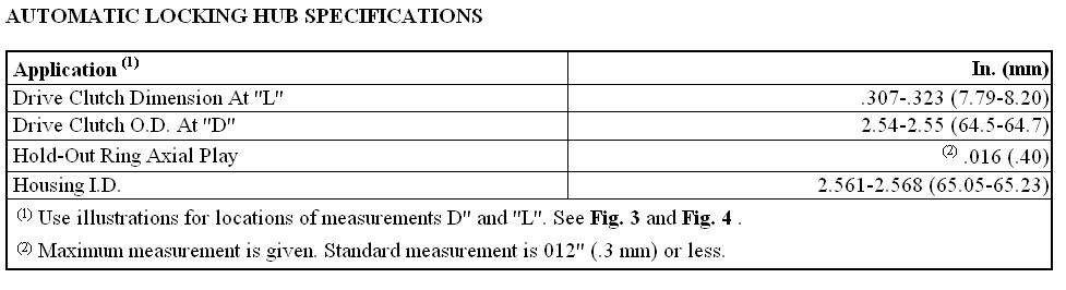 2. Using feeler gauge, measure hold-out ring axial play of drive clutch assembly. See Fig. 2. Measure drive clutch assembly at dimensions "L" and "D." See Fig. 3 and Fig. 4. Replace component if not within specification. See AUTOMATIC LOCKING HUB SPECIFICATIONS table.