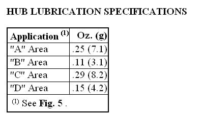 4. Remove gauge. DO NOT remove inner cam. Apply multipurpose grease to axle shaft splines. Apply grease to proper areas of drive clutch assembly and housing. See Fig. 5. Apply proper amount of grease to designated areas. See HUB LUBRICATION SPECIFICATIONS table.