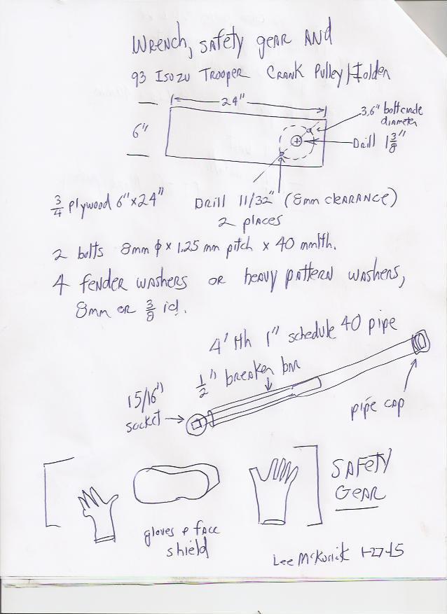 For the Isuzu crank pulley bolt, the torque needed was 300 or 400 ft. Lbs. I broke two pulley holder tools before the following plywood tool suvived the torque applied.