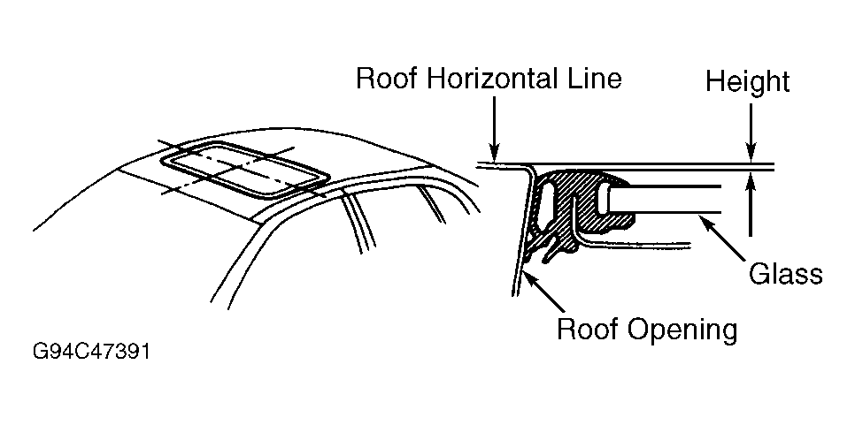 Fully close the sun roof. Measure sun roof height (distance between horizontal line of roof top and horizontal line of weatherstrip). See Fig 1. See SUN ROOF HEIGHT SPECIFICATIONS table. If height is not as specified, pry out garnishes (trim pieces) from left and right sides of sun roof opening.