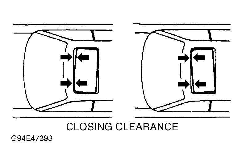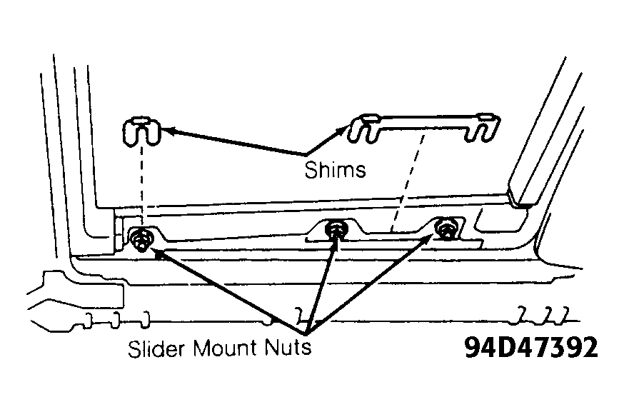 Closing clearance is incorrect if glass is not square with the opening. See Fig 1. To adjust, pry out garnishes (trim pieces) from left and right sides of sun roof opening. Loosen slider mount nuts. See Figure. Reposition glass. Tighten nut