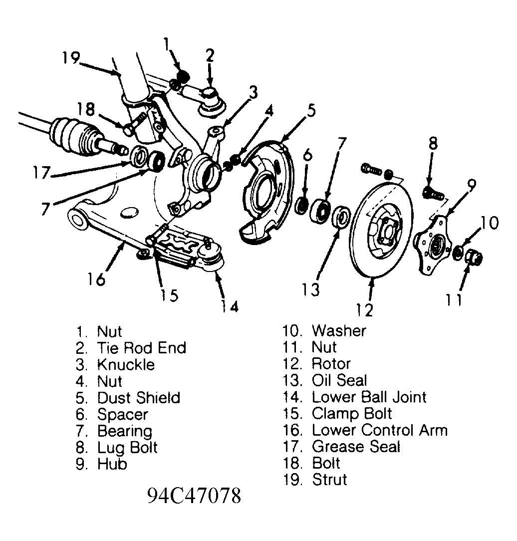 Disconnect brake hose from strut (if necessary). Remove brake caliper from knuckle, and wire out of way. Remove nuts and bolts holding ball joint and strut to knuckle assembly.