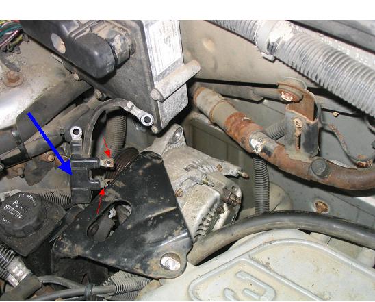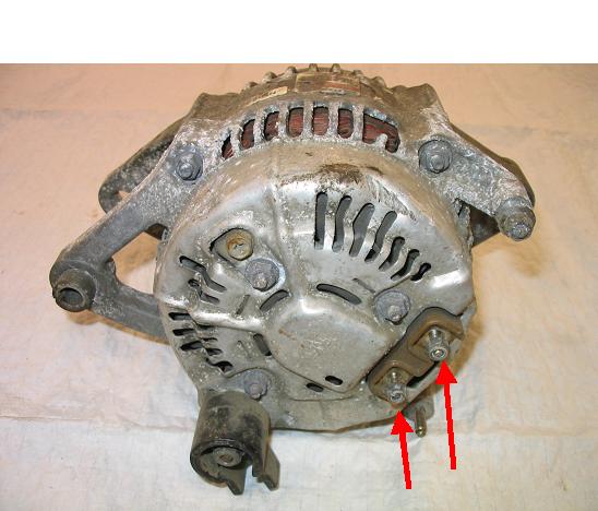 Nope. Disregard code 17. ALL Chryslers will have that one in winter. You MIGHT get valid results with a test light instead of a voltmeter. Does the back of your alternator look similar to the one in this photo? If so, there will be a small black plastic block bolted to it. Wait, I'll post another photo. In the second photo the block has been unbolted but the blue arrow shows what it looks like. The two red arrows show where to measure the voltages. If you use a test light instead, tell me how bright the light is while the engine is running. One terminal should have a bright light. The second one will be either just as bright, out completely, or fairly bright and flickering rapidly.