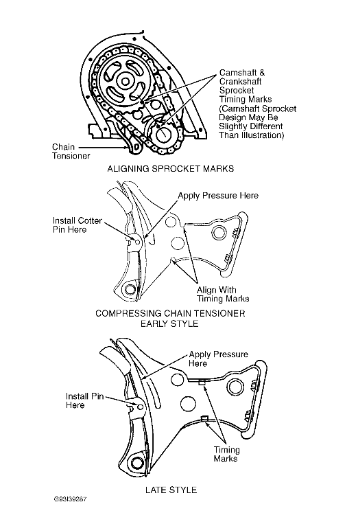 Fig. 5: Aligning Timing Marks & Compressing Chain Tensioner