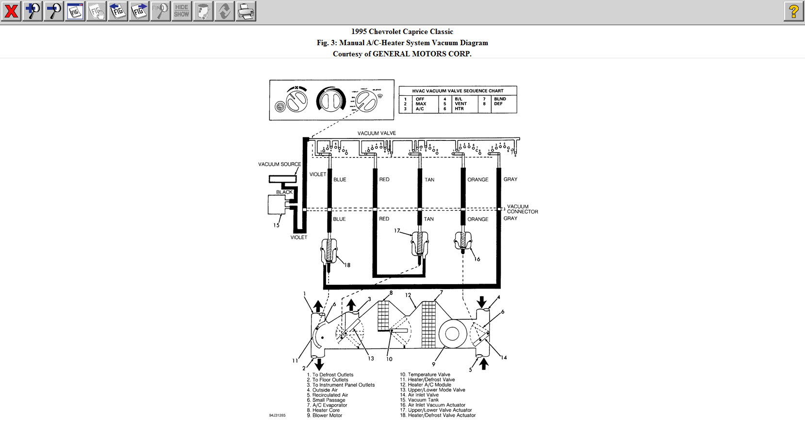Here is a diagram for vacuum for your system. You probably have a vacuum leak. The source is the engine and the tank may be onthe firewal or under the hood. Check to see if your blend doorsare getting vacuuum