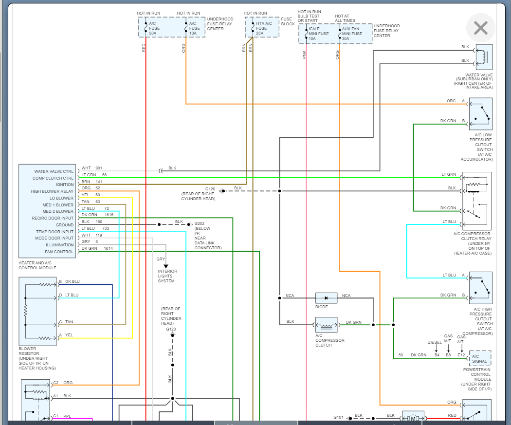 I have a 1995 Chevrolet Suburban that the a/c fan speed works on every position except high. I have replaced the resistor and the fan speed switch. Neither of those things fixed the problem. With the connector off the blower motor and a test light attached, power is present in all positions except high. When switched to the high speed position power is not present in the lead. Please advise. Thank you so much for any direction you might offer me.