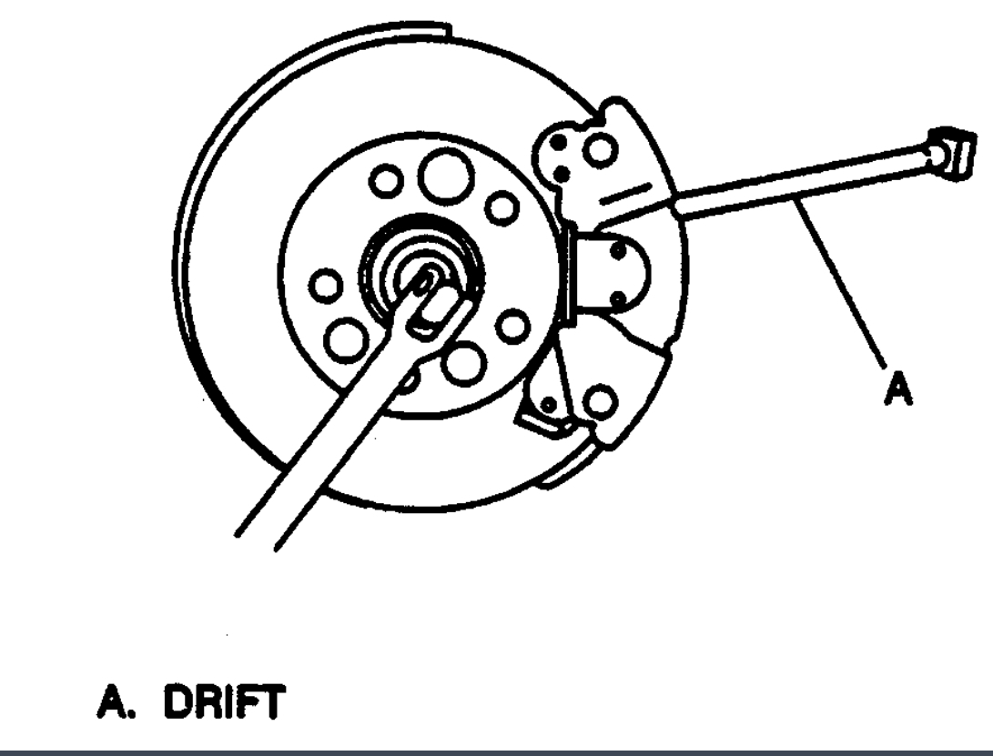 - Insert a drift or large screwdriver through the brake caliper into one of the brake rotor vanes to prevent drive axle from turning.