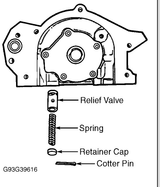 The oil pump is inside the timing cover. But do not see any place for the oil pressure relief valve to go.