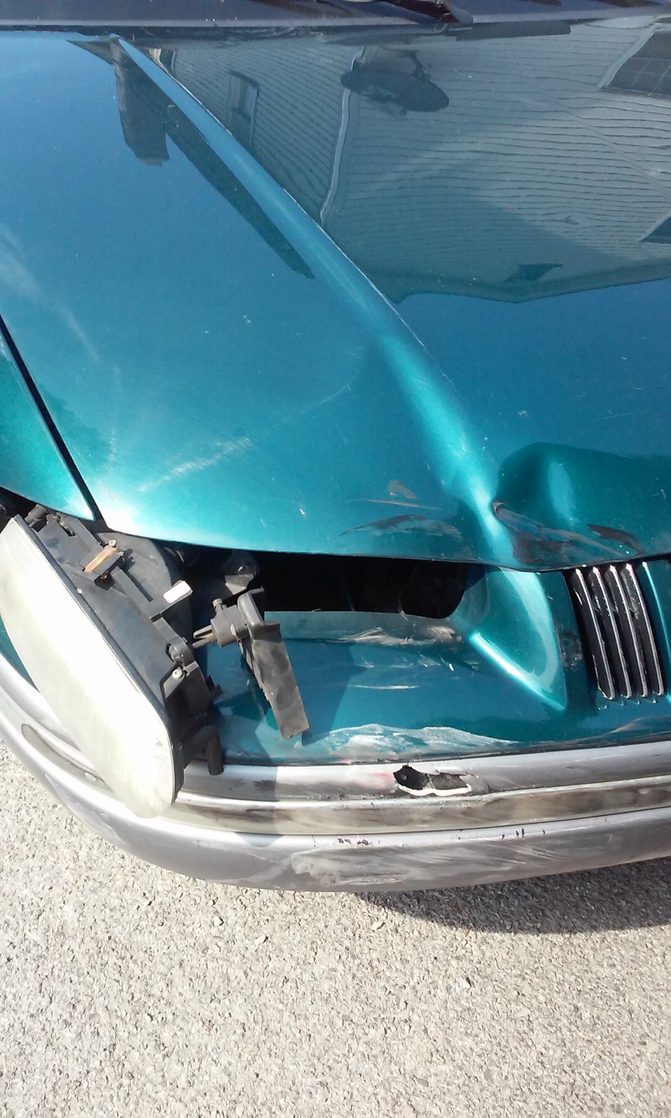 Can you tap out the dent from the under side of hood? Or remove the hood, then tap out the dent? I'm really not a body person. I can't tell if headlamp assembly is busted?