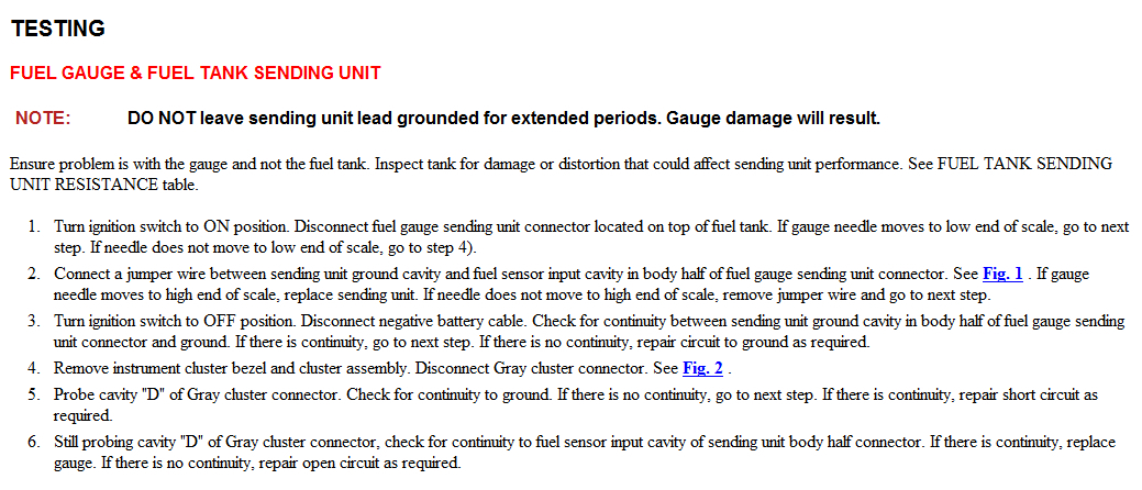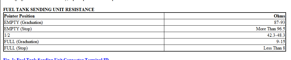 It seems fuel gauge is stuck in full, or you have defected connector. Check fig 1 for complete procedure how to diagnosis fig 4 for sensor resistance values.