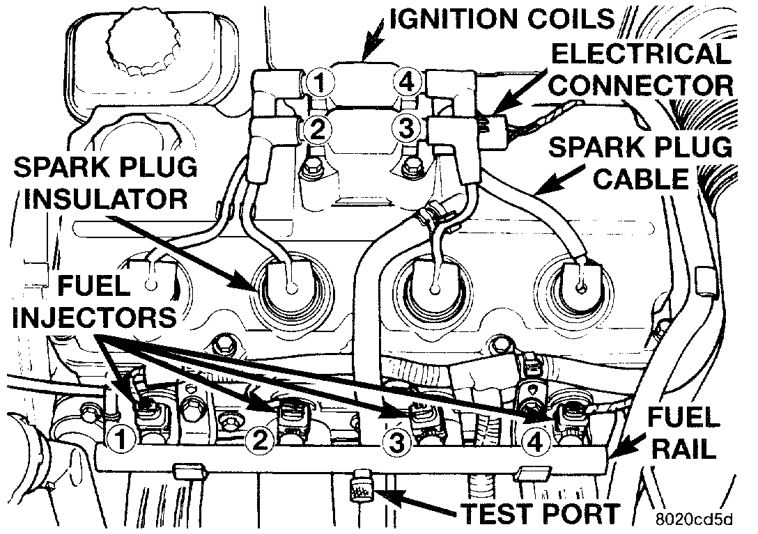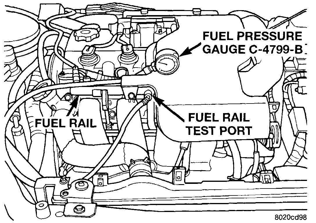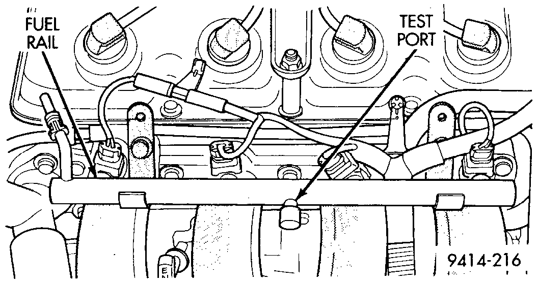 NOTE: The fuel system operates at approximately 331 kPa (48 psi). Check fuel system pressure at the test port on the fuel rail (Fig. 7).