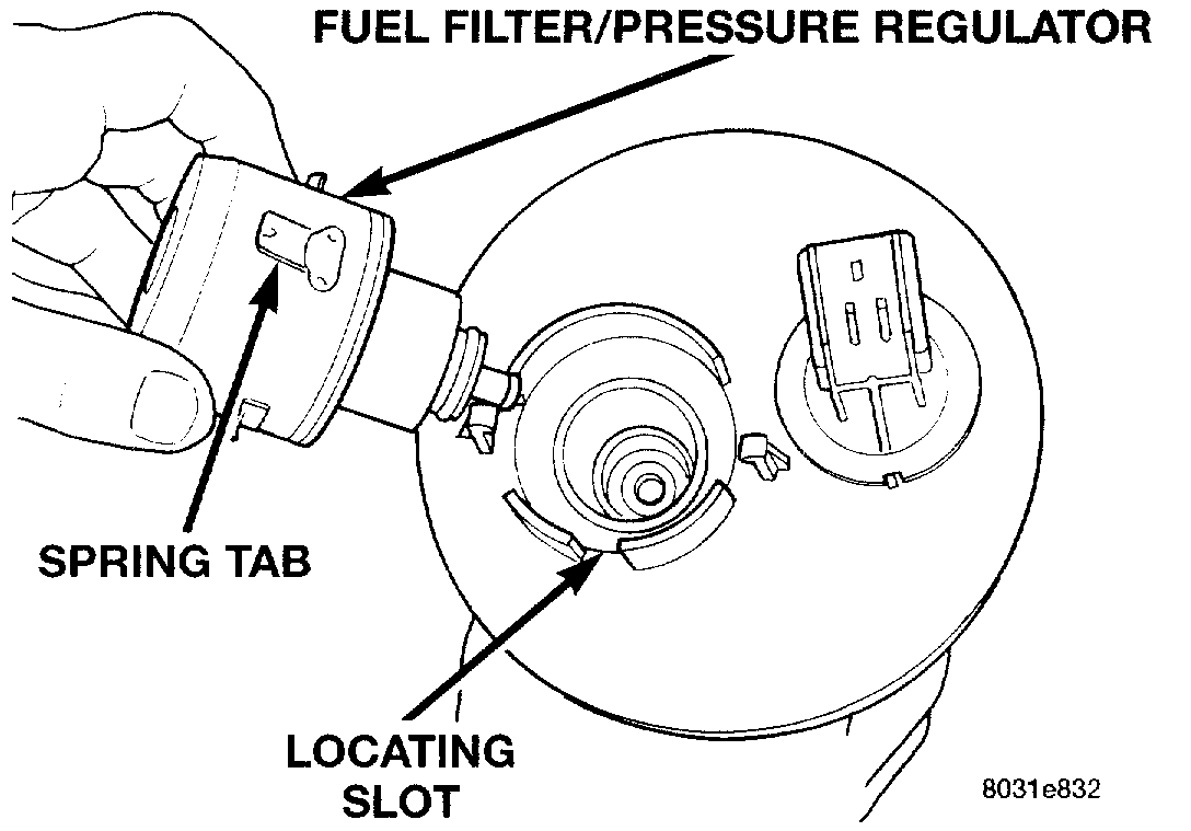 1. Insert filter/regulator into the opening in the fuel pump module, align the two hold down tabs with the flange.