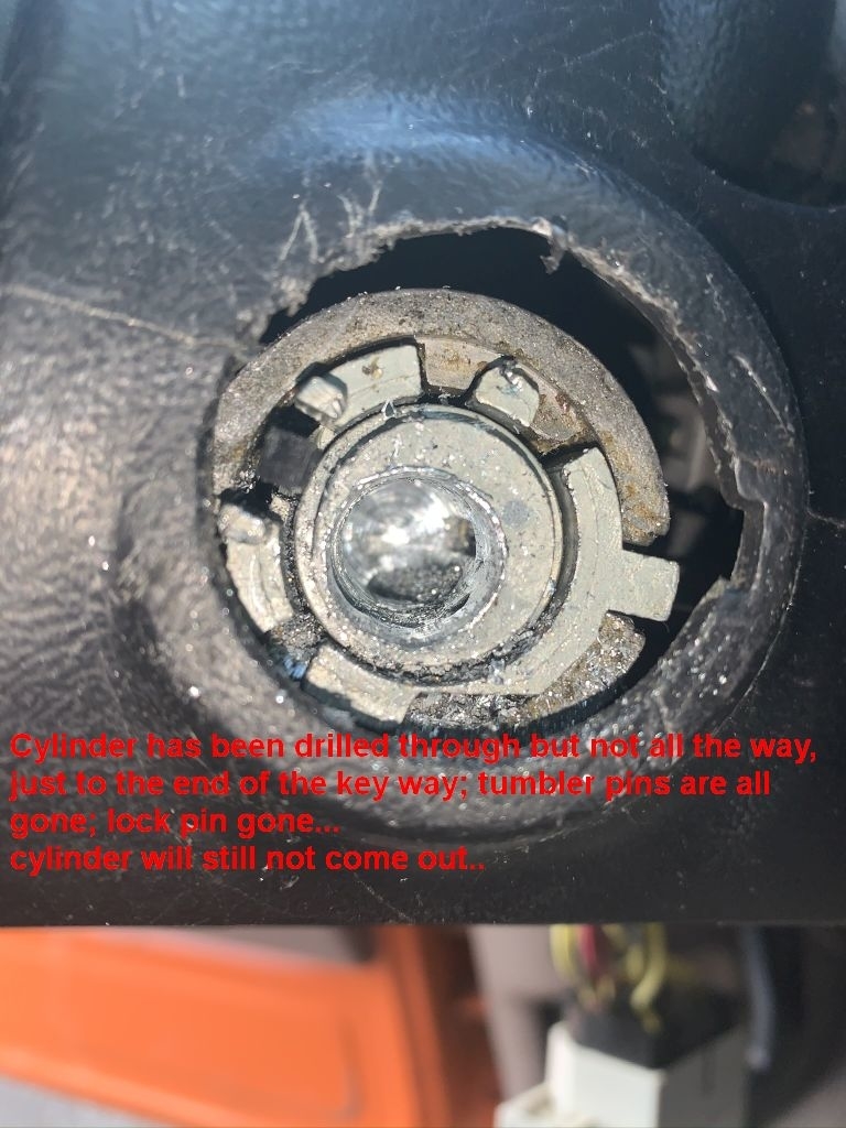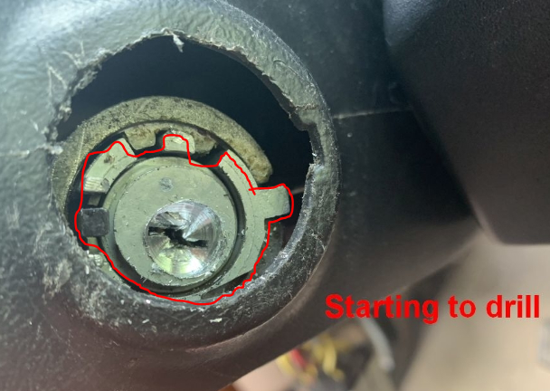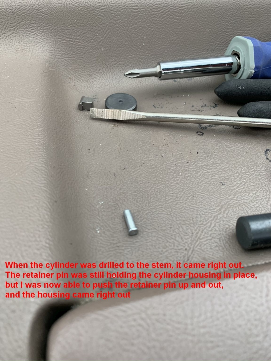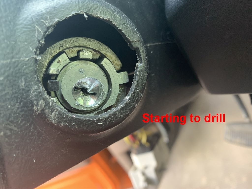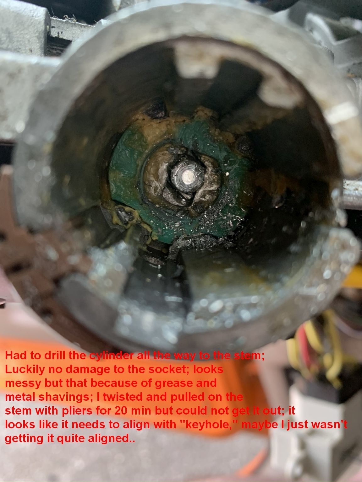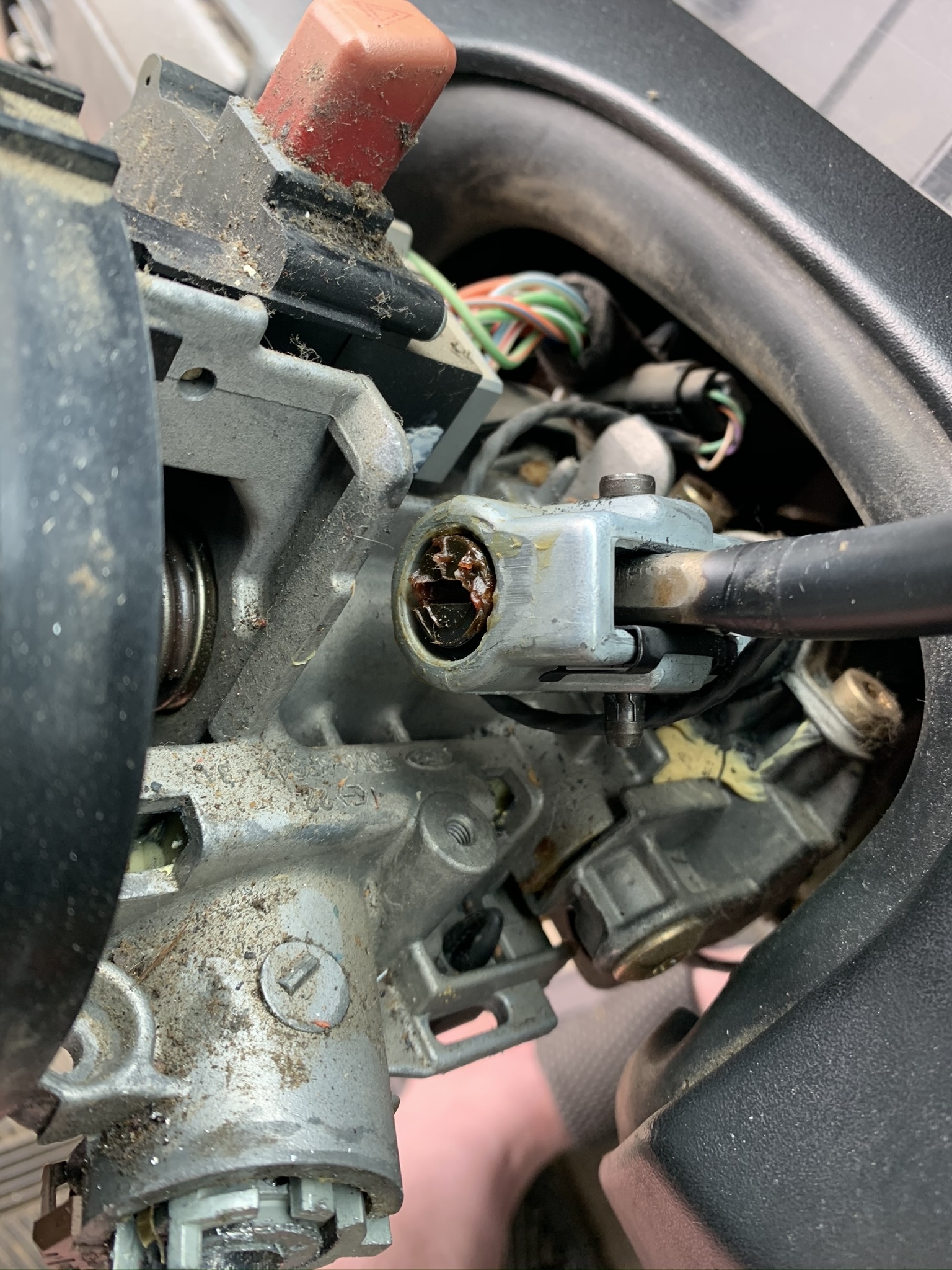 I have not yet finished drilling out the lock or replacing the shift interlock. But I did manage to get the top cover removed from the steering column. I'm not sure whether you meant for the steering column to be dropped while doing this. There are earlier photos of the dropped steering column. So here are some photos of the top of the un-dropped steering column.