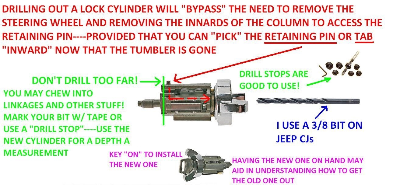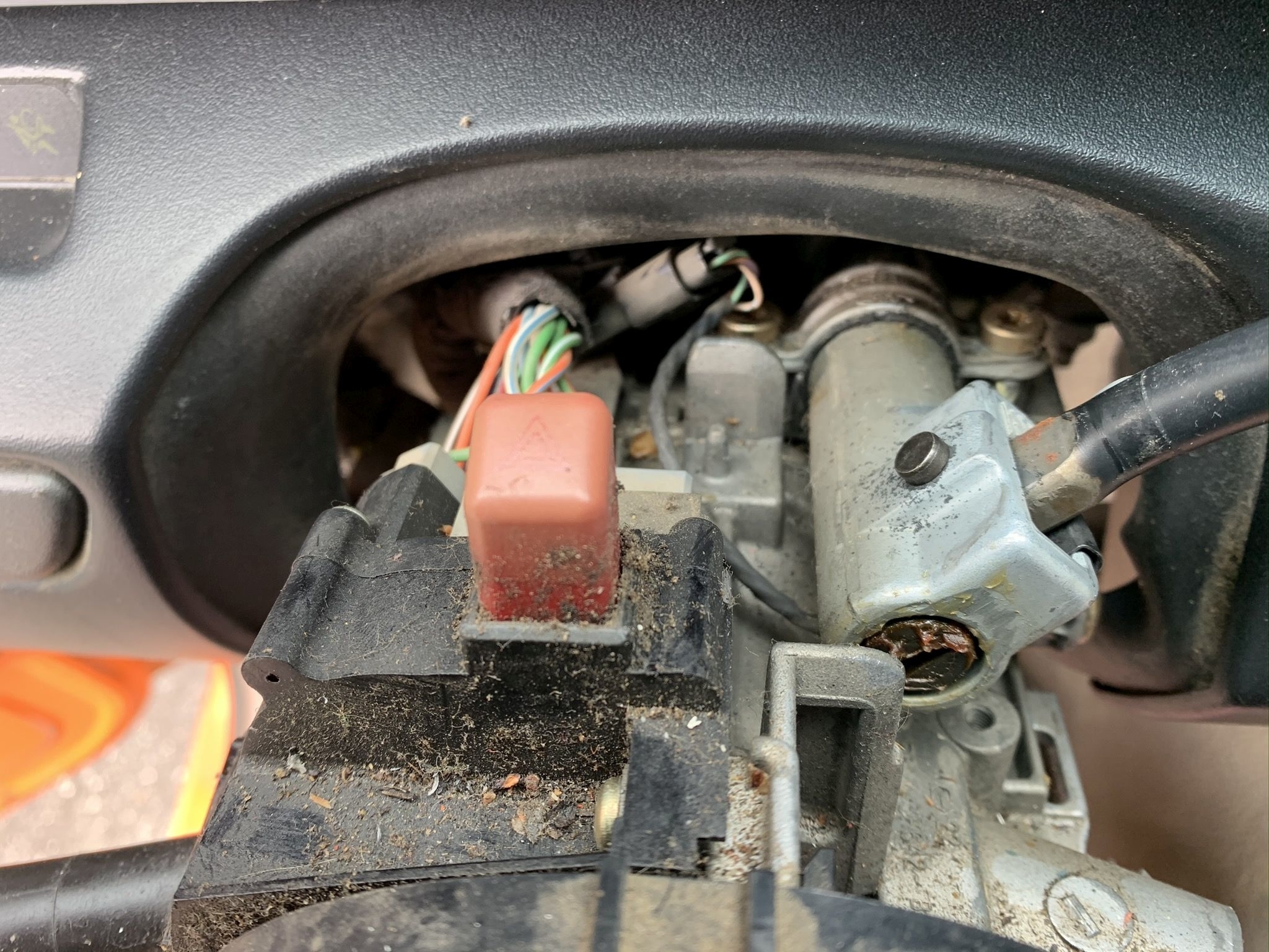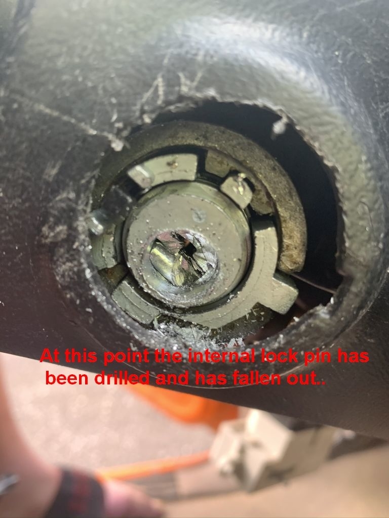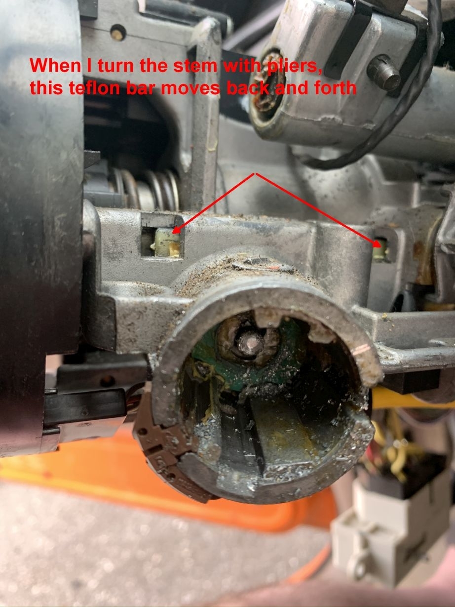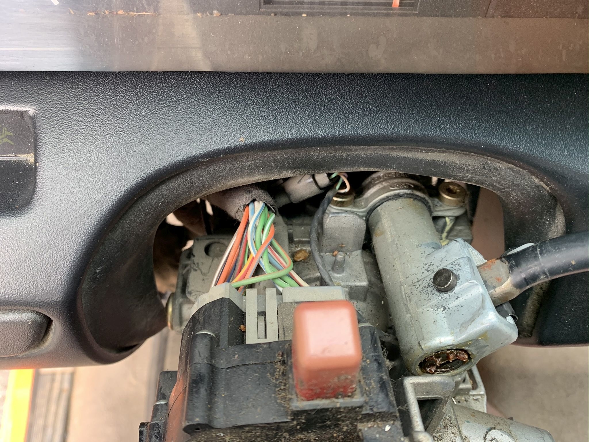 I have not yet finished drilling out the lock or replacing the shift interlock. But I did manage to get the top cover removed from the steering column. I'm not sure whether you meant for the steering column to be dropped while doing this. There are earlier photos of the dropped steering column. So here are some photos of the top of the un-dropped steering column.