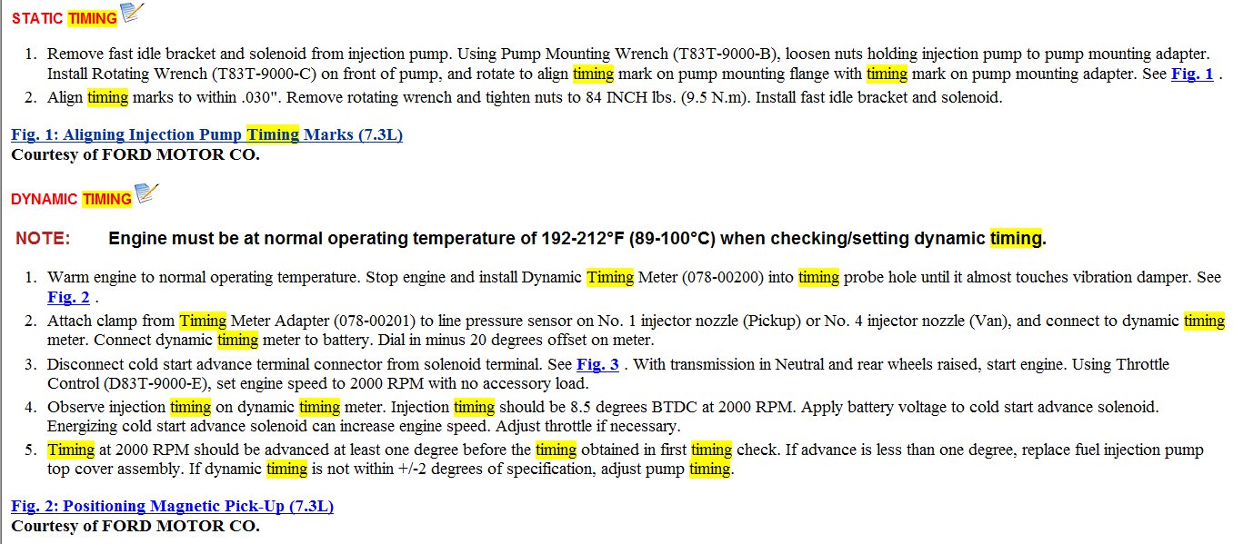 However, the injector pump does have some adjust-ability in a static and dynamic test procedure. There is a special tool needed to compare the crankshaft position pulse to the Fuel Injector Pulse. It is set more advanced than the ignition. It is 8.5 DBTDC at 2,000 RPM's, it is in instructions I am giving you. The ignition timing is mostly off of the camshaft position and is non adjustable but it can be checked and should be 10 BTDC.