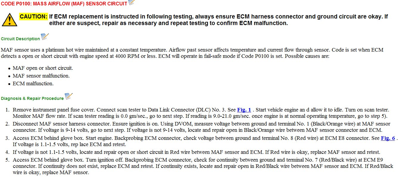 This prob. Is intermittent. Changed old Battery, the next day the engine light came on I checked the obd and codes po100, po110 came up. Symmptoms are afterthe car starts in park 900 rpms usually 1000-1100. Put in drive and step on the gas and it bogs right down but rpms level off and does not stall. To get up to 30 mph I have to keep it in low and gradually give it more gas. If I step on the gas normally it bogs right down. Then shift to second then drive rpms never get over 2.5. Then after driving 10 miles or so locally the engine light goes off then back on and the car resumes normal working condition. It feels like not enough fuel to engine.
