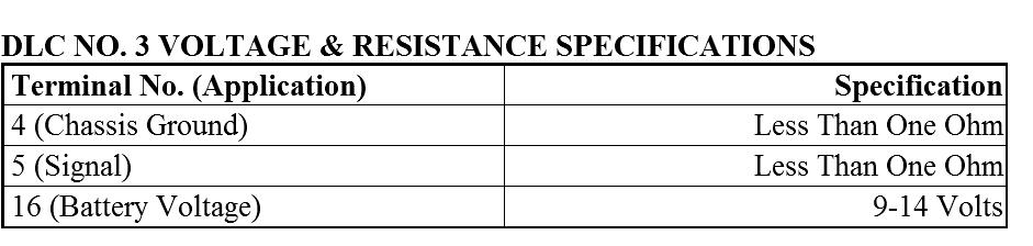 3. Check voltage and resistance between ground and specified terminal on DLC No. 3. See DLC NO. 3 VOLTAGE & RESISTANCE SPECIFICATIONS table. See Fig. 2. If voltage and resistance readings are not as specified, check wiring circuit.