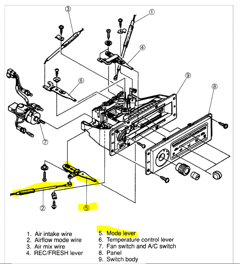 On this vehicle, the airflow direction is controlled by what is called a mode door. On this vehicle, it is actuated via a control lever (at the dash) and a cable.