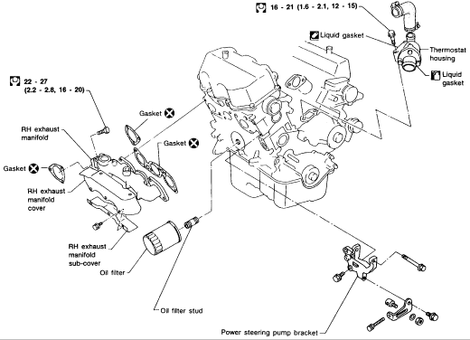 When installing the thermostat, always use a new gasket with sealer and make sure the thermostat spring is facing the inside of the engine. The water outlet housing on VG30i and VG30E engines has the letters UPR and an arrow embossed on the flange edge; they should always be pointing up. The KA24E, VG30i and VG30E engines have a jiggle valve on the thermostat which should always be facing up. Water outlet mounting screws should be tightened to 12-15 ft. Lbs. (16-21 Nm) on all engines but the KA24E, which should be tightened to 5-6 ft. Lbs. (7-8 Nm). Refill and check the coolant level.