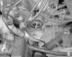 Remove the water inlet (disconnect electrical wiring) and remove the thermostat. Carefully observe the positioning of the thermostat within the housing. Clean all mounting surfaces before installation.
