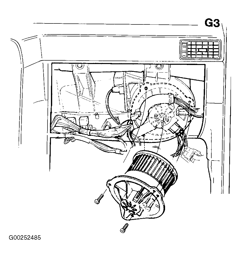 Disconnect fan motor connector (G3). Remove cable duct from motor and remove connectors from brackets. Remove 4 screws holding motor and remove motor. See Fig. 9.