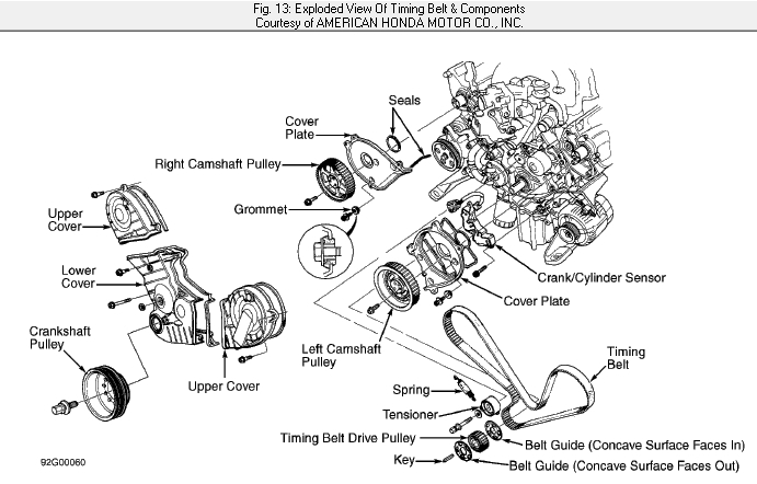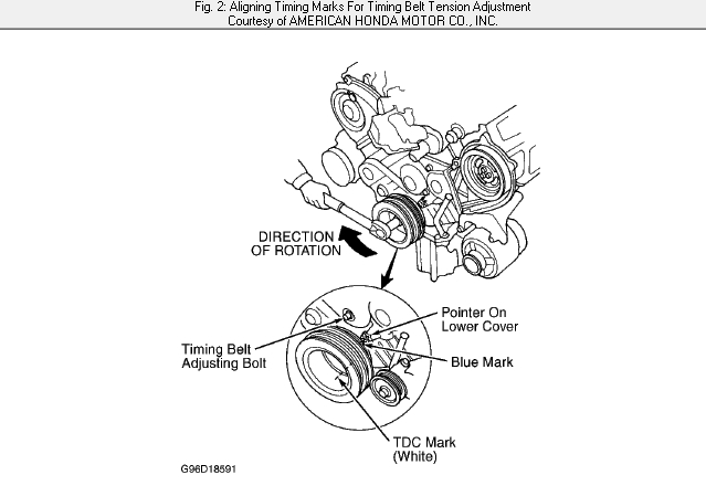 8. Remove idler pulley, dipstick and tube. Remove crank pully, remove upper and lower timing belt covers see (fig4)below. If reusing timing belt mark direction of belt rotation for installation reference. Loosen timing belt tensioner adjusting bolt 180 degrees. Push tensioner to release belt tension. And then retighten adjusting bolt. Remove timing belt.