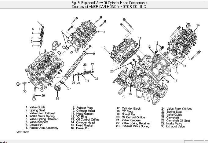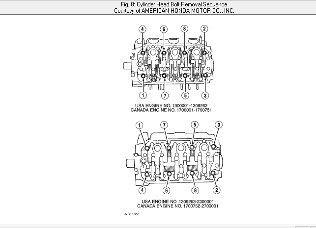 12. Remove ignition coil packs from right and left head covers. Remove left and right camshaft pulleys, then remove left and right back covers. Remove crank/cylinder sensor from left cylinder head. Remove left and right cylinder head covers. Remove generator mounting bracket bolts and power steering pump mounting bolts. Remove cylinder head bolts, in squence, 1/3 turn at a time, repeat procedure until all bolts are loose. See (fig5)below. Remove cylinder head.
