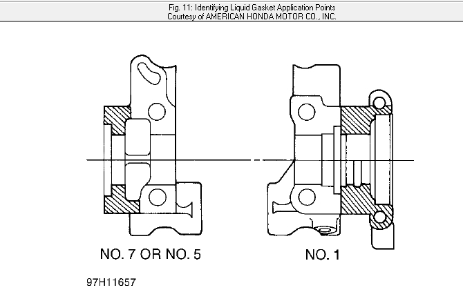 4. Apply liquid gasket sealer to indicated area(head mating surface of No 1 and 7 camshaft holders USA engine No 1300001-1309262 and canada engine NO 1700001-1700751. No1 and 5 camshaft holders USA engine No 1309263-2300001 and canada engine No 1700752-2700001). See (fig9). Install cylinder head covers.
