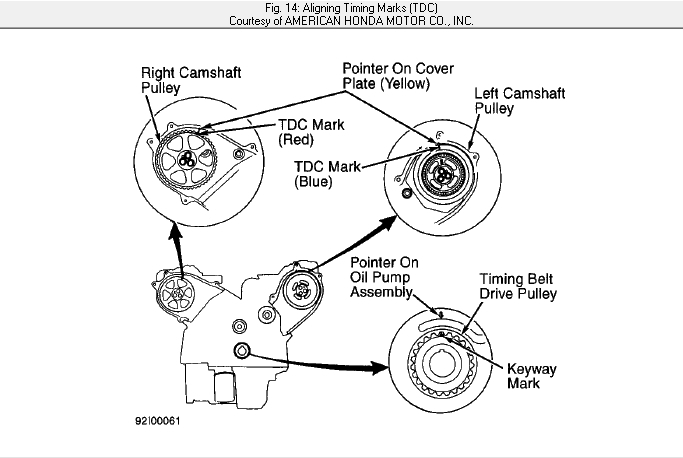 5. To install engine belt, ensure No 1 piston at TDC of compression stroke. Position crankshaft and camshaft pulleys as as shown prior to timing belt installation see (fig 10).