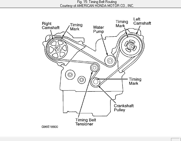 6. Install timing belt onto crank pulley, tension adjuster pulley, left camshaft pulley, water pump pulley, and right camshaft pulley in that order see (fig11). Loosen and retighten timing belt idler pulley adjusting bolt to tension the timing belt. Install crankshaft pulley rotate crankshaft clockwise 5-6 turns to properly position timing belt on pulleys. Adjust timing tension.(Fig11).