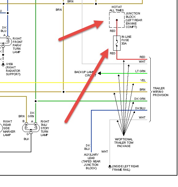 I'm trying to find the 30 amp(red) feed wire that runs from the rear of the truck to the "instrument panel fuse block". This red wire, along with the other RV/trailer wires(which I've located), are in a bundle (harness) at the rear. The owners manual states that the red wire is a "30 amp feed wire with an in line fuse located in the instrument fuse block with no connector". I'm familiar as to where the easily accessible fuse box is (at the end of the dash on the drivers side). However I'm wanting to know where exactly is the "other" fuse panel located. Also, does a substantial amount of under dash panels have to be removed, and will any A/C ducting have to be removed to gain access to this fuse panel? Will this red wire be easily noticeable? Thanks in advance for your time. Robb Browne